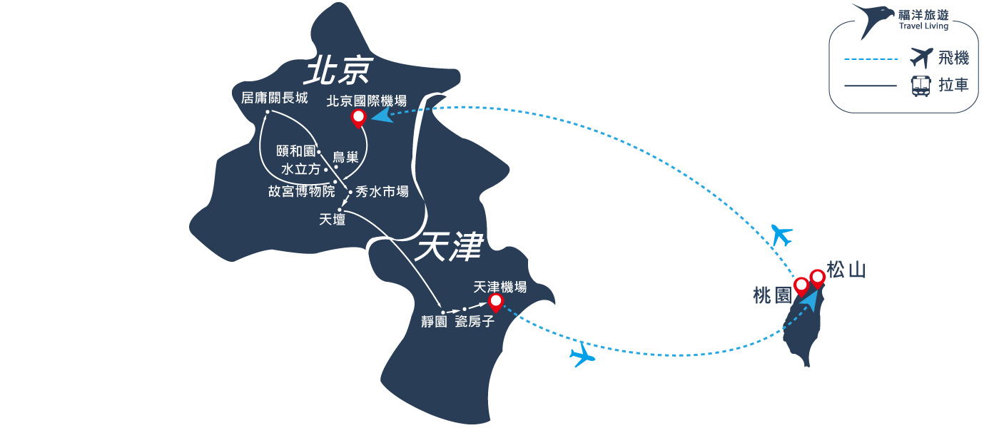 北京(天壇、奧運主場館-鳥巢、水立方外觀)→(約134公里,車程約1小時30分)天津(靜園、瓷房子、乘馬車遊五大道地區、海河夜景)
