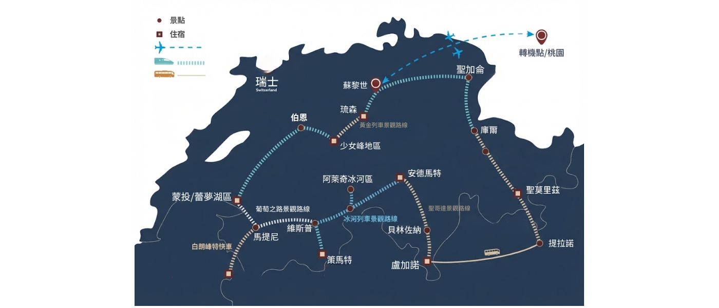 - 全程火車使用瑞士旅行通行證Swiss Travel Pass預定,如配合鐵道公司調整相關艙等無價差。